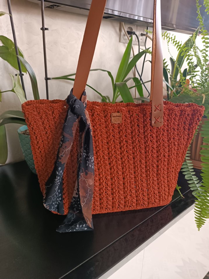 Bu kahverengi örgü kadın çanta, deri saplarla ve yanındaki koyu desenli fularla tamamlanmış rahat bir dokunuşa sahip. Bohem ve retro tarzlar için uygundur.