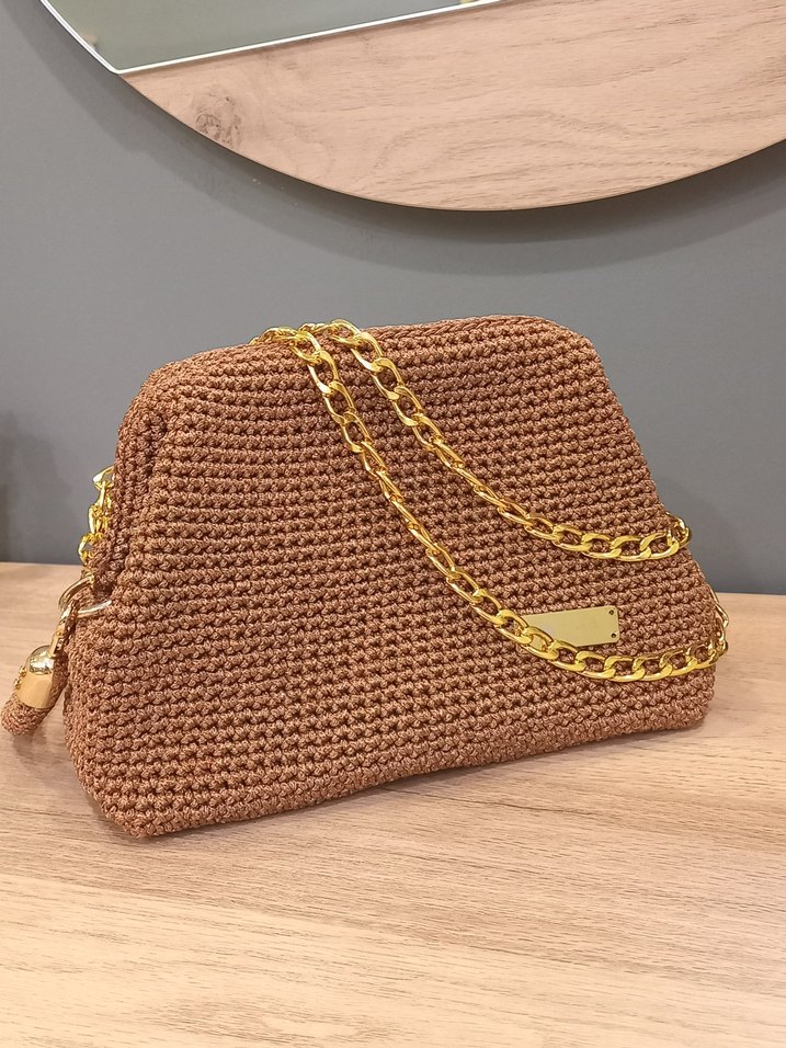 Parlak detaylı, örgü kahverengi kadın çantası, altın zincir askılı, bohem ve rahat tarzlara uygun. 20 cm burslu İçi astarlıdır. Sipariş üzerine çalışılmaktadır. Sipariş verildiği anda 3 gün içinde kargoya verilir.