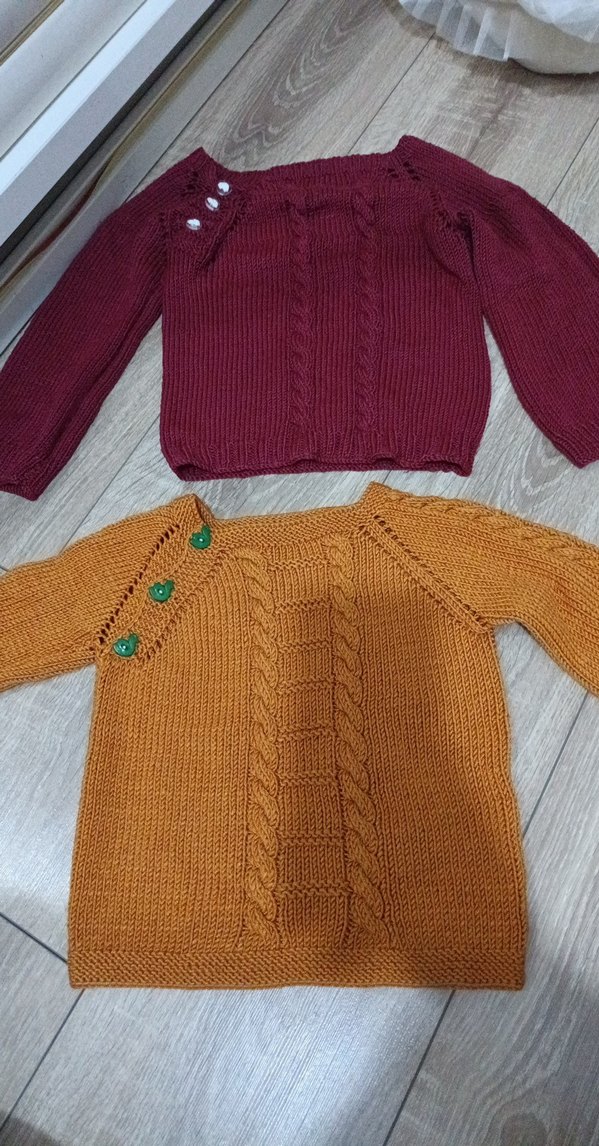 Bohem tarzda, uzun kollu, örgü kız erkek çocuk kazaklari, kahverengi ve koyu kırmızı renklerde, omuzda süslü düğmelerle. çok az giyildi el emegidir.