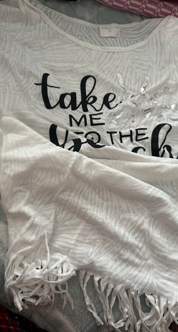 Bohem desenli, salaş kesim ve püskül detaylı, 'take ME to the beach' yazılı.