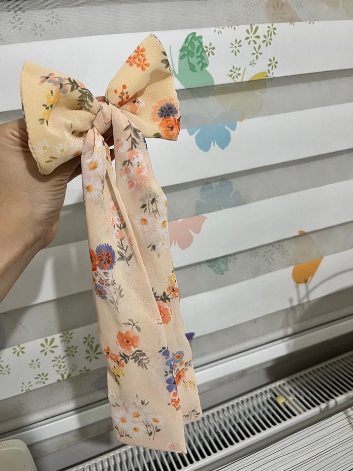 Pastel renklerde çiçek desenli, sentetik kumaştan yapılmış bej fiyonk saç aksesuarı. Bohem, hippie ve retro tarzlara uygun.