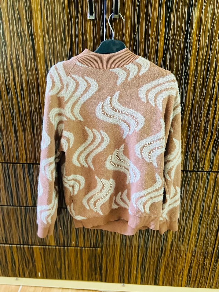 Pastel kahverengi, uzun kollu, bol kesim, kısa boy, bohem tarzda örgü kazak. Rahat ve günlük kullanıma uygun.