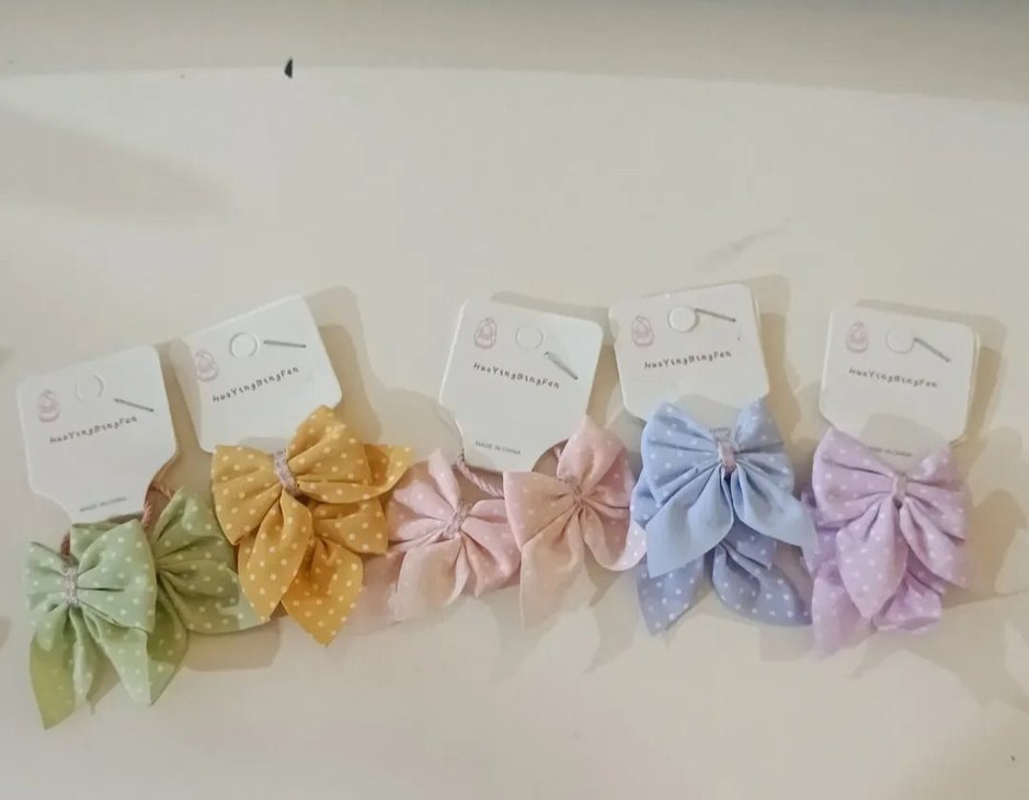 Bohem tarzda, yumuşak tie-dye desenli, pastel renklerde çok renkli fiyonk tokalar.