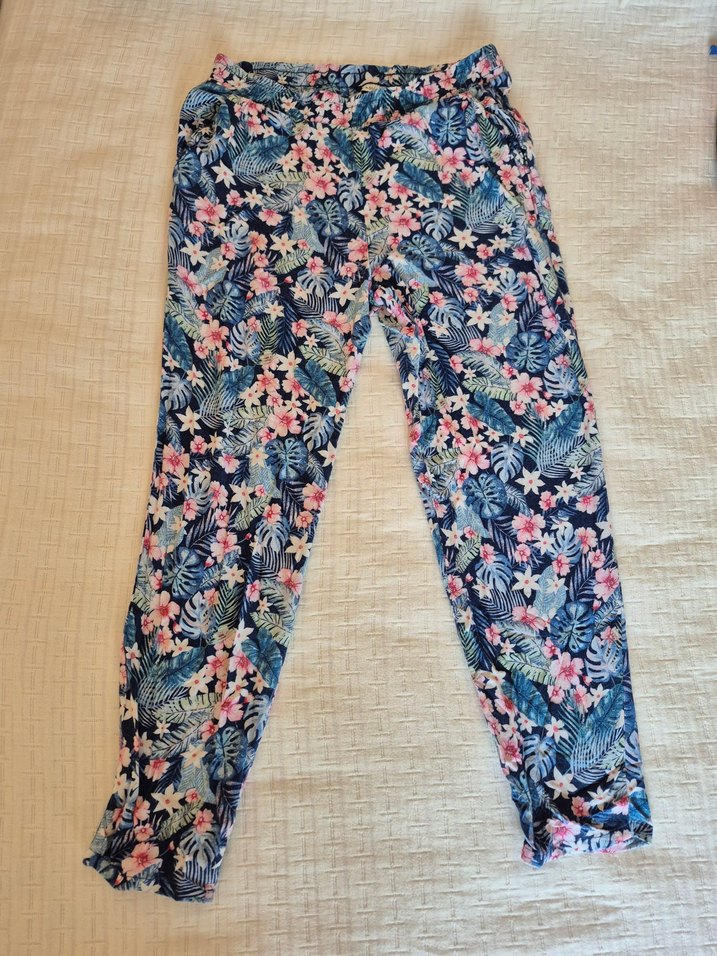midi boyda, pastel çok renkli çiçek ve yaprak desenli kadın günlük pantolon. Rahat ve günlük kullanıma uygun. basen 47cm, boy 90cm. hiçbir deformasyonu yok.