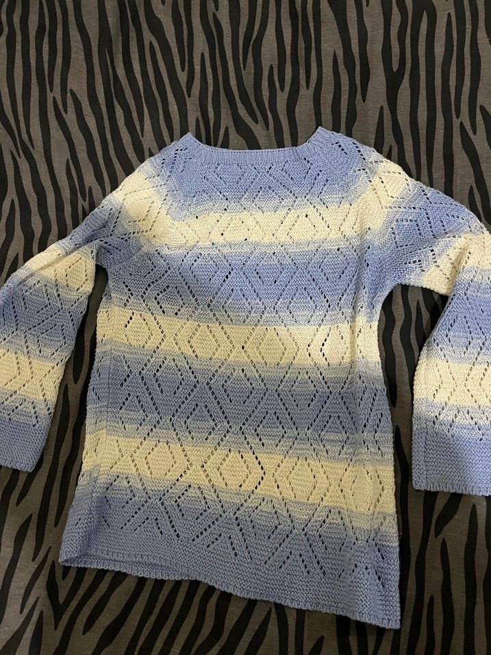 Örgü desenli, uzun kollu ve kayık yaka kadın kazak. Gevşek kesim, pastel çok renkli ve bohem tarzda, rahat kullanım için uygundur.