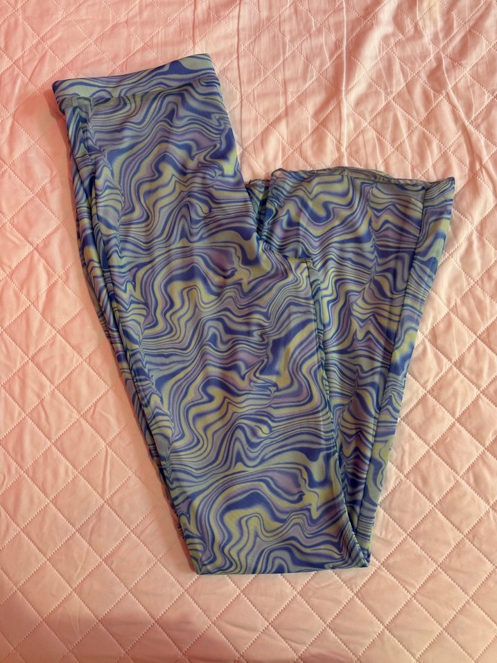 Kadınlar için pastel tie-dye desenli, drapeli ve uzun kesimli, yumuşak sentetik kumaştan yapılmış bohem tarzda dar kesim pantolon.