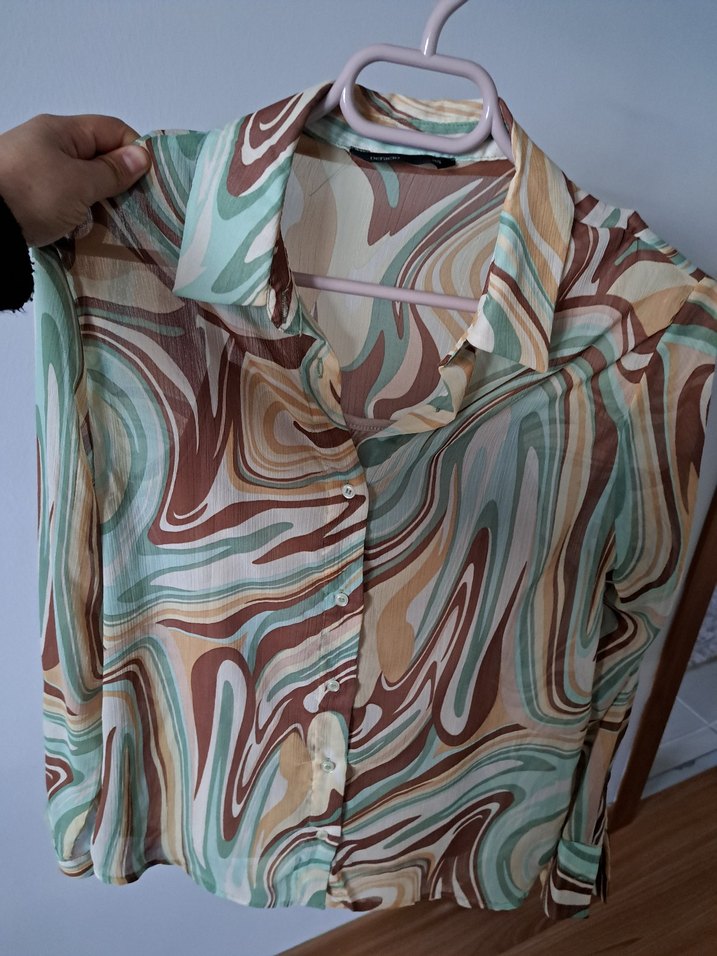 Bohem tarzda, düğmeli ve yakalı kadın gömleği. Pastel renkli batik desenli, kahverengi tonlarında, sentetik yumuşak kumaştan, rahat kesim ve uzun kollu.