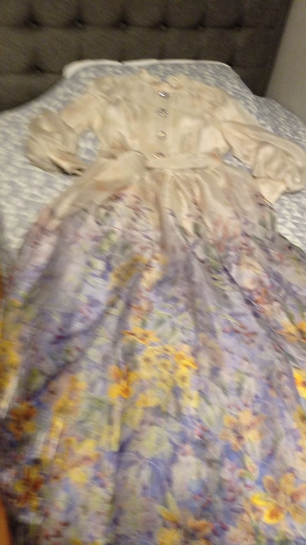 Bu uzun, bol kesim elbise, pastel tonlarda tie-dye desenli ipeksi kumaştan yapılmıştır. Yuvarlak yakalı ve drapeli detaylıdır, düğün için uygundur. ✨