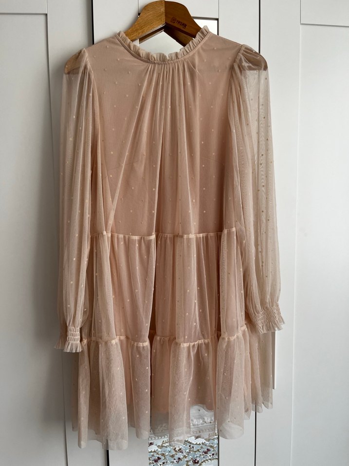 Yüksek yakalı, bol kesim pudra pembesi elbise. Uzun tül kollar ve nakış detaylarıyla aşşırı tatlı ister yazlık bir elbise ister tesettür tunik olarak kullanılabilir. Hiçbir sorunu yok yalnızca bir kez giyildi. #elbise #tunik #hm #tül #pembe