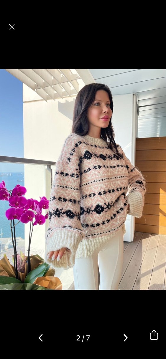 Pembe pastel tonlarda, etnik desenli, bol kesim triko kazak. Uzun kollu ve yuvarlak yakalı, kısa günlük kullanıma uygun rahat bohem stil midi uzunlukta kazak. Zara muadili kazak