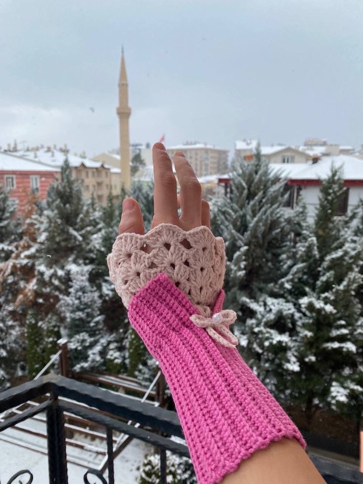 Pembe örgü kadın eldivenleri, bohem tarzda pastel tonlarla ve bilekte ince dantel detaylarla tasarlanmıştır. Sıcak ve retro bir görünüm sunar.