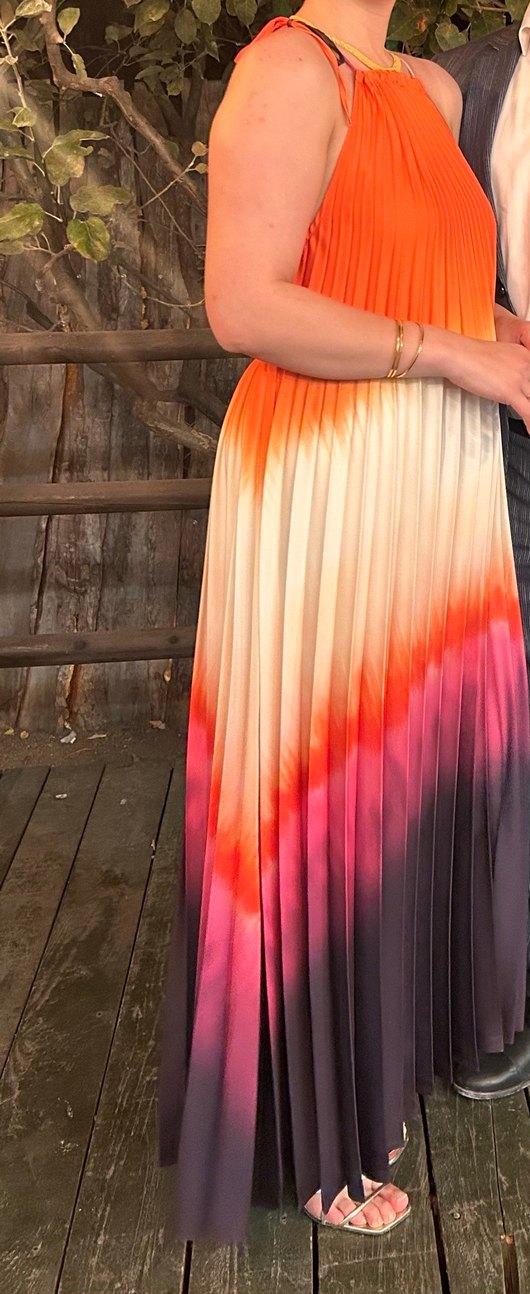 Boyundan bağlamalı, pileli, uzun ve renkli tie-dye desenli kadın elbisesi. Yumuşak sentetik kumaştan, bol kesim ve ince askılı, bohem tarzda parti elbisesi.