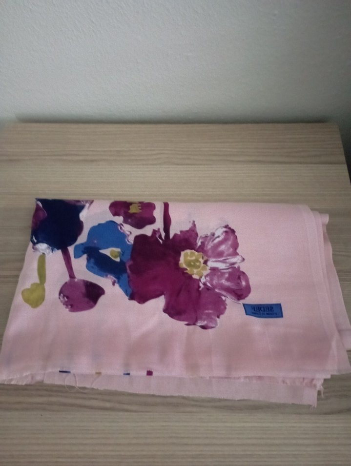 Pastel pudra renginde, canlı çiçek desenli, yumuşak sentetik kumaştan bohem tarzda drapeli kadın fular.