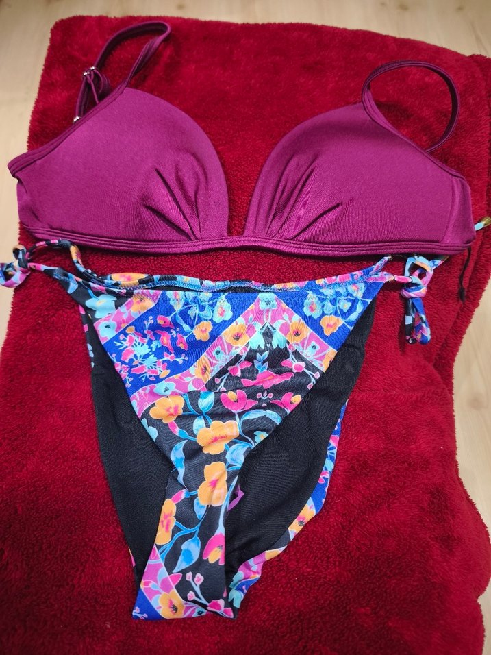 Bohem tarzda, askılı mor üst ve renkli desenli, yanları lastikli alt parçadan oluşan kadın bikini. Plaj için uygun. ️