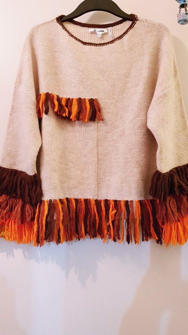 Kadınlar için uzun kollu, yuvarlak yaka, bol kesim örme kazak. Kahverengi, turuncu ve kırmızı püsküllerle renkli etnik desenli, kısa boyda bohem tarzına uygun.