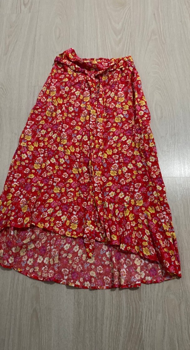 Renkli uzun etek, bol kesim ve drapeli tasarımıyla canlı tie-dye desenine sahip, bohem tarzı yansıtır.