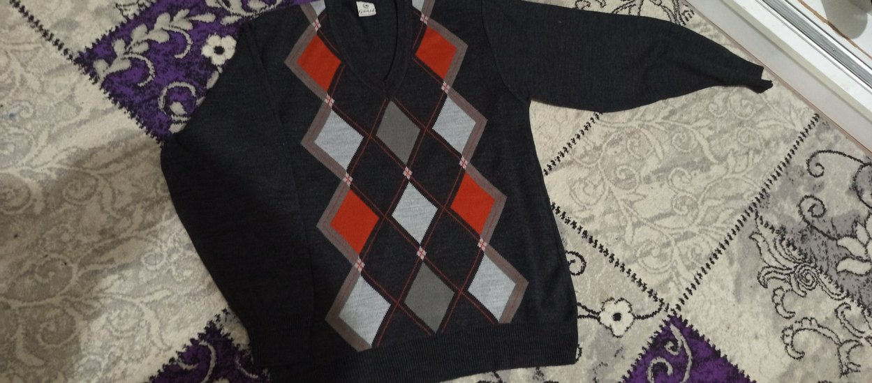 Koyu gri yün kumaştan örülmüş, desenli ve V yaka uzun kollu kazak. Bohem, retro tarzıyla günlük kullanıma uygun, regular fit ve uzun boy.