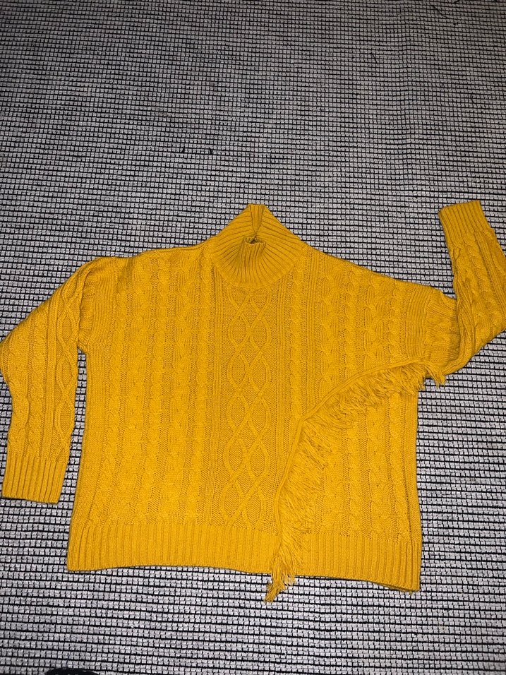 Sarı renkli, bohem tarz uzun kollu, balıkçı yaka, normal boy, bol kesim kazak. Günlük kullanıma uygundur. Hiç giyilmedi