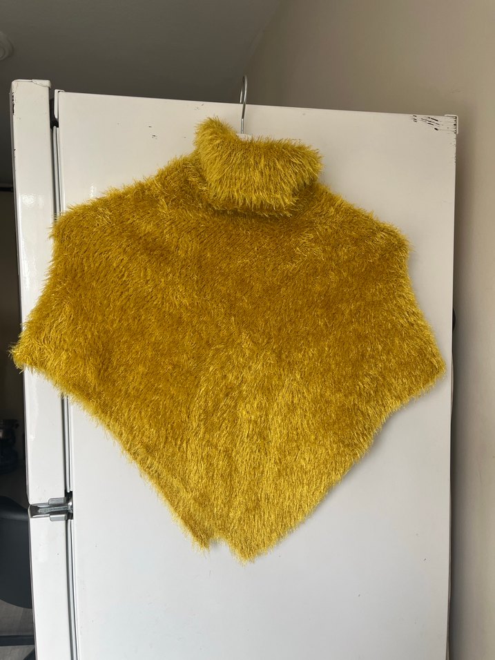 Bol kesim, bohem tarzda sarı, tüylü detaylı, uzun kollu ve boğazlı şal.Yumuşak ve parlak görünümüyle rahat bir seçenek.