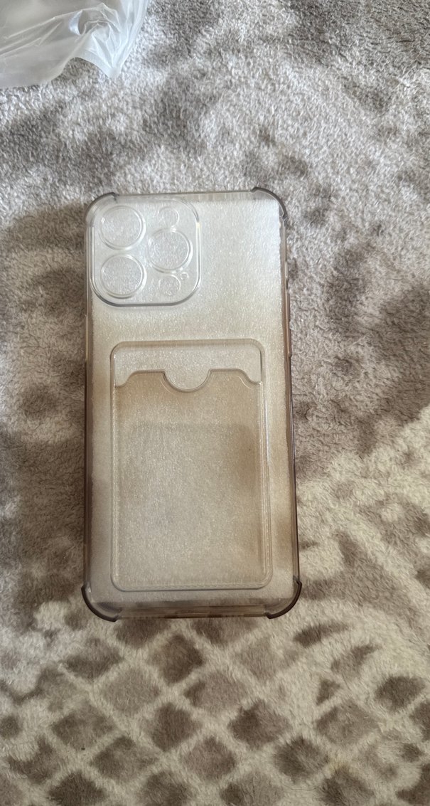 Bohem tarzda, şeffaf ve bej renkte telefon kılıfı, gri tonlarda ve kartlık bölmeli.iPhone 15 Pro Max ile uyumludur kullanıma bağlı sararma mevcuttur