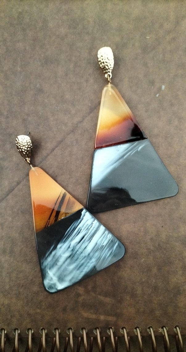 Bohem tarzda, şeffaf bölümlü, koyu renkli çok renkli batik desenli uzun üçgen küpeler, açık hava etkinlikleri için uygun. 1 kere kullanıldı. dezenfekte edilmiştir.