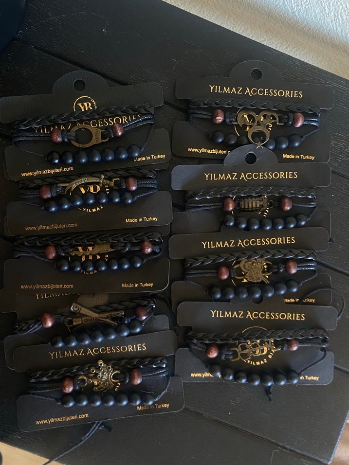 Yilmaz Accessories imzalı, boncuk ve metal detaylı koyu siyah bohem erkek bileklikleri. Türkiye yapımı, retro hippie tarzı için uygun.