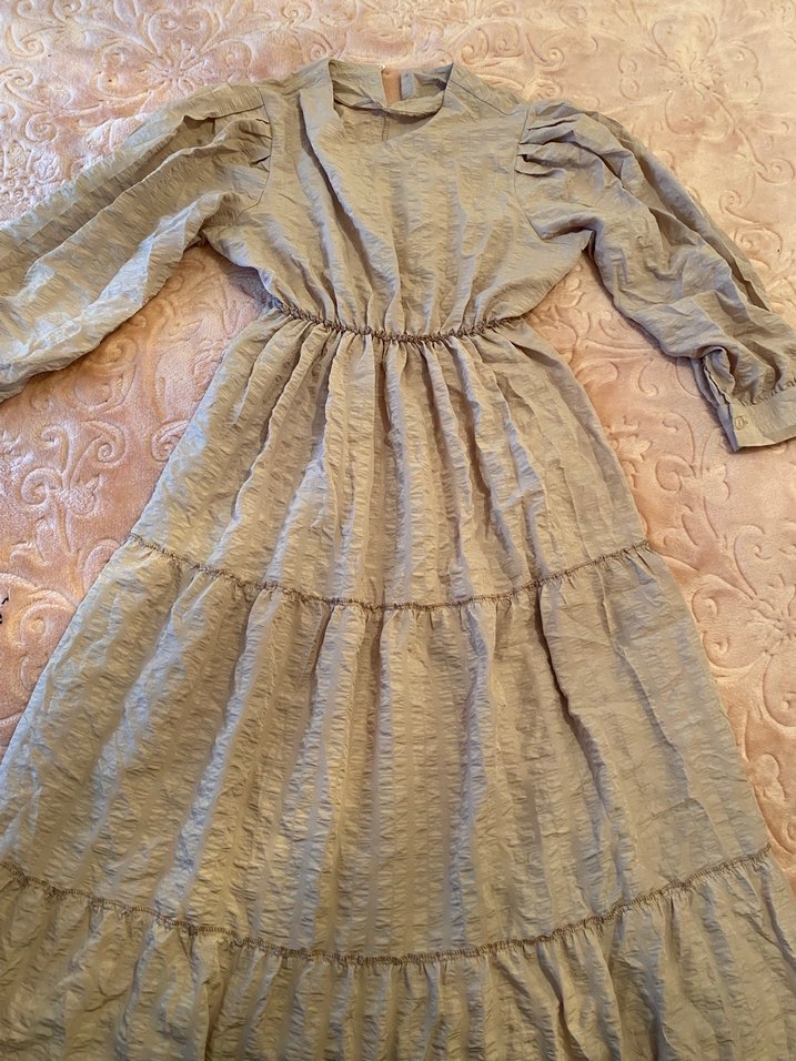 Bohem tarzda, keten kumaştan yapılmış, sütlü kahve renkli, uzun ve bol kesim elbise. Fırfır detaylı ve yuvarlak yakalı, günlük kullanım için klasik şıklık sunar. Az kullanılmıştır