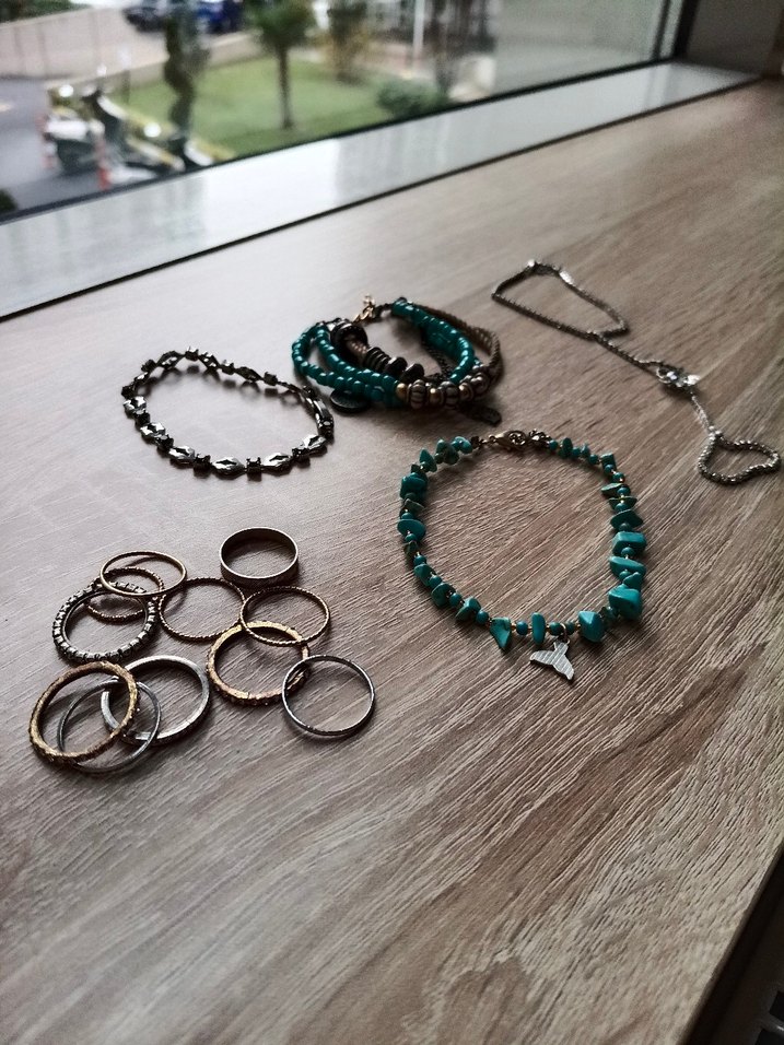 Hepsi az kullanılmıştır sadece 1-2 yüzükte kararma var Bohem ve günlük stile uygun, turkuaz tonlarında doğal taş görünümlü bileklik. Hafif yapısı sayesinde gün boyu rahatlıkla kullanılabilir. Yaz–kış kombinlerinize kolayca uyum sağlar. #takı #bileklik #yüzük #bohem #minimal #turkuaz #aksesuar #kadıntakı #kombin