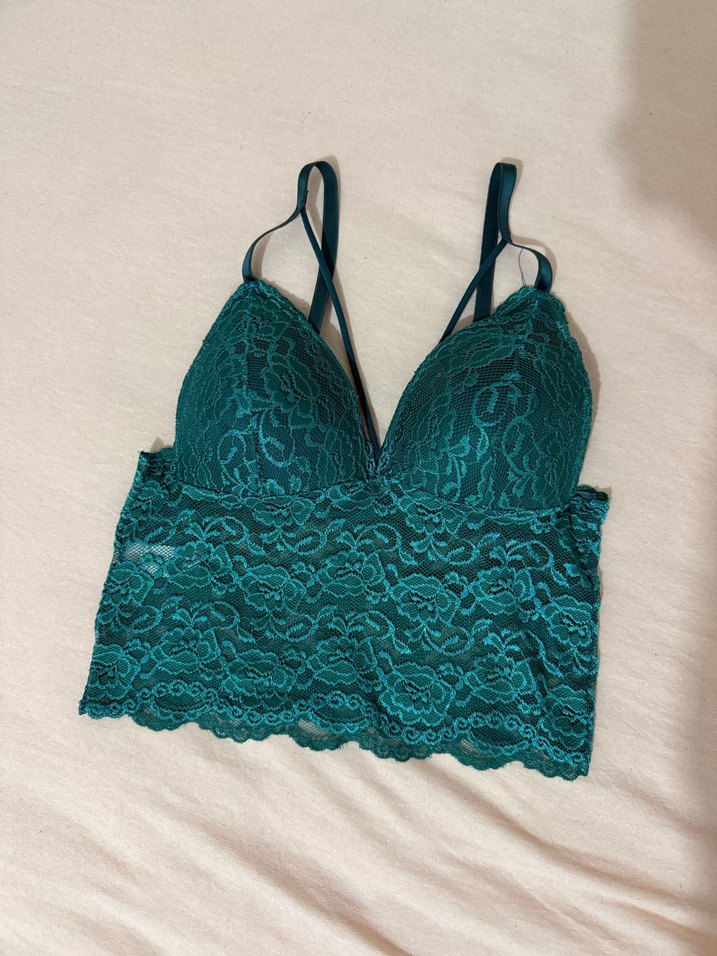 Ayarlanabilir askılı, midi uzunlukta, koyu turkuaz dantel kumaştan bohem tarzda bralet. Hiç giyilmedi . Beden 80/B. Yarı destekli
