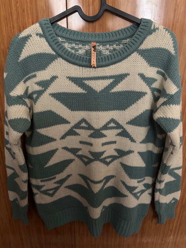 Bohem tarzda, uzun kollu ve yuvarlak yakalı, yumuşak örgü kumaştan yapılmış bol kesim turkuaz ve gri geometrik desenli kadın kazak.