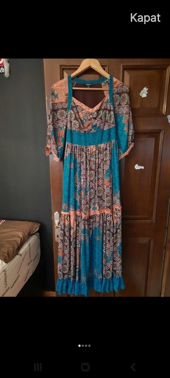 Turkuaz renkli, bağlama desenli, bol kesim ve dökümlü uzun elbise. V yaka ve askılı kollara sahip, bohem tarz için uygun.