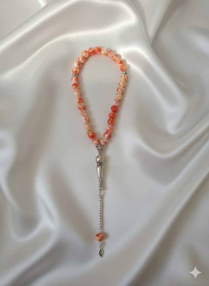 Bohem tarzda, turuncu renkli boncuklardan oluşan erkek tesbih, gümüş detaylarla süslenmiştir.