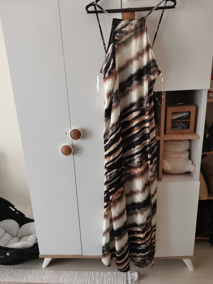 İpli, uzun ve bol kesim kadın elbisesi. Kahverengi-gri batik desenli, dökümlü tasarıma sahip, yumuşak sentetik kumaştan. Bohem tarzını yansıtıyor.