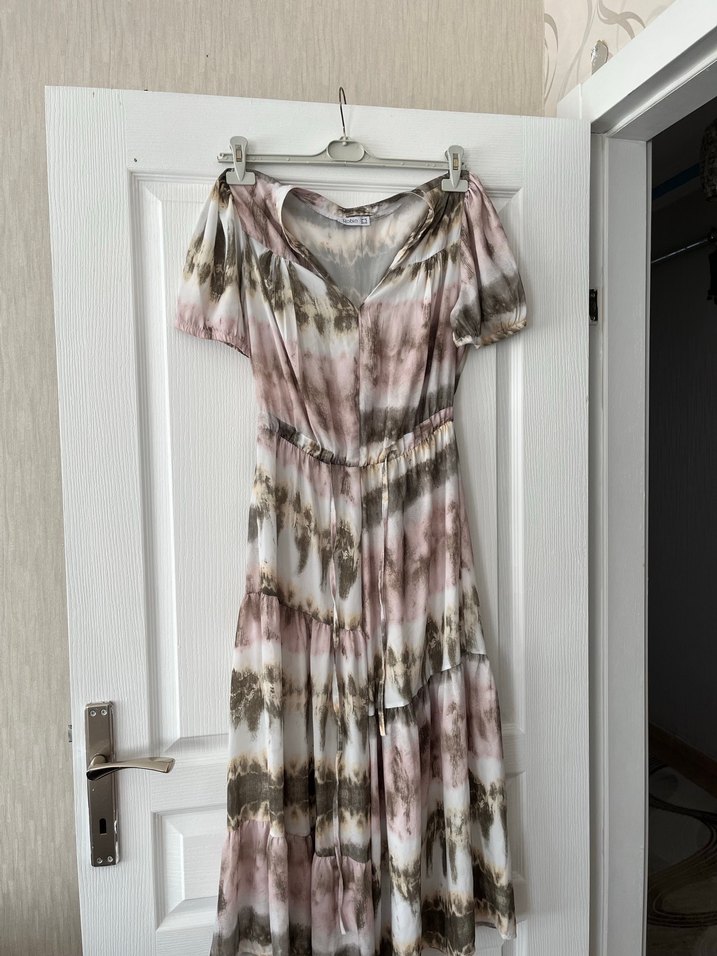 Bej renkte, bol kesim ve dökümlü tasarıma sahip, kayık yaka ve askılı kollu bohem tarz uzun elbise, yumuşak sentetik kumaştan üretilmiştir.