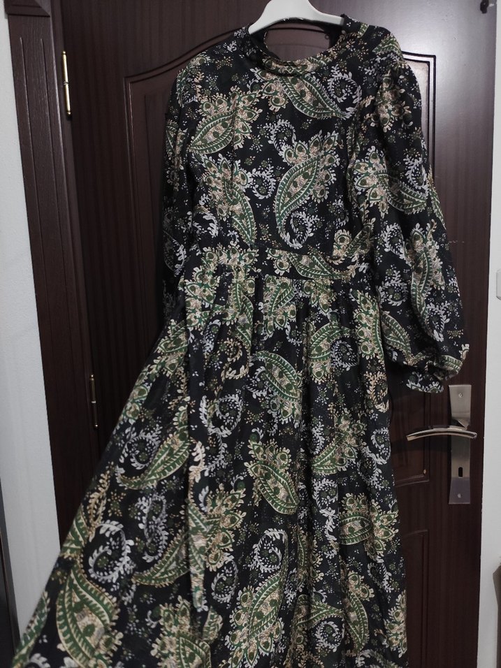 Bohem tarzda, uzun balon kollu, yüksek yakalı ve bol kesim kemerli desenli elbise. Drapeli tasarımıyla günlük ve mütevazı kullanıma uygundur.