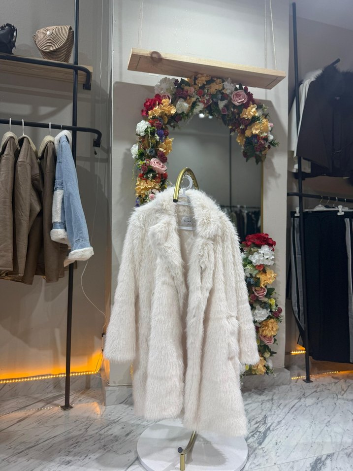 Uzun beyaz suni kürk kaban, bol kesim ve yakalı tasarımıyla rahat ve bohem tarzı bir görünüm sunar. Düğün ve retro stiller için uygundur. ❄️
