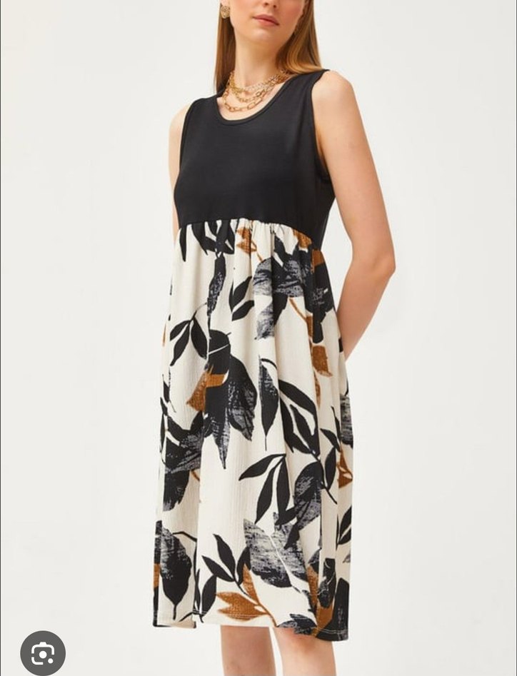 Kolsuz, uzun ve bol kesim hamile elbisesi. Üst kısmı koyu renkte, etek kısmı bej zemin üzerine siyah ve kahverengi desenli, günlük kullanım için uygun.