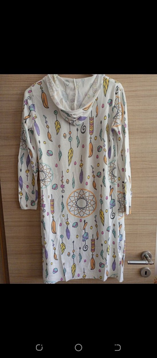 Uzun, bol kesim kadın elbisesi, uzun kollu ve kapüşonlu, pastel çok renkli baskılı desene sahip, bohem tarzını yansıtıyor.