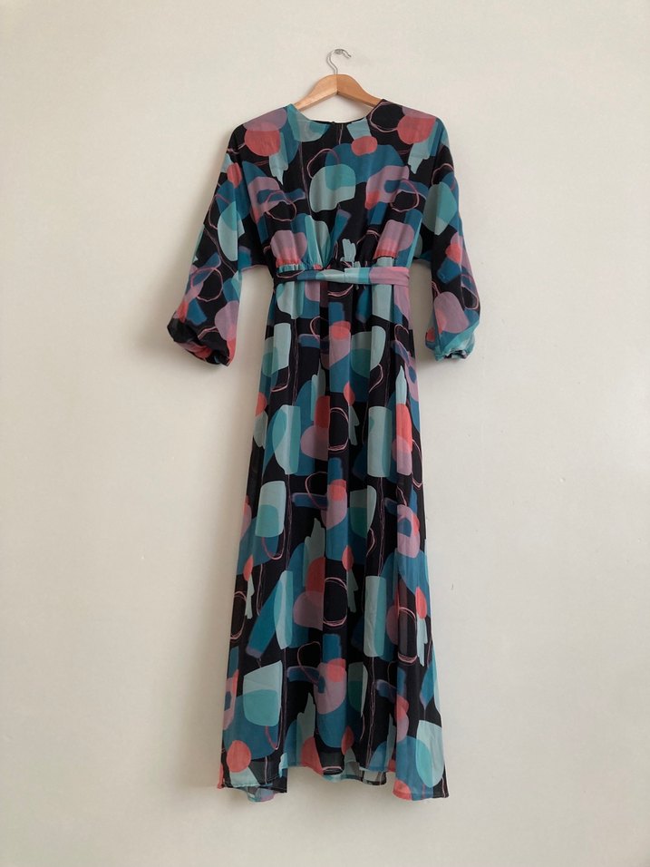 Renkli geometrik desenli, fermuar detaylı, kemerli ve yarım kollu, bol kesim astarlı, midi boy kadın elbisesi, yumuşak sentetik kumaştan yapılmıştır.