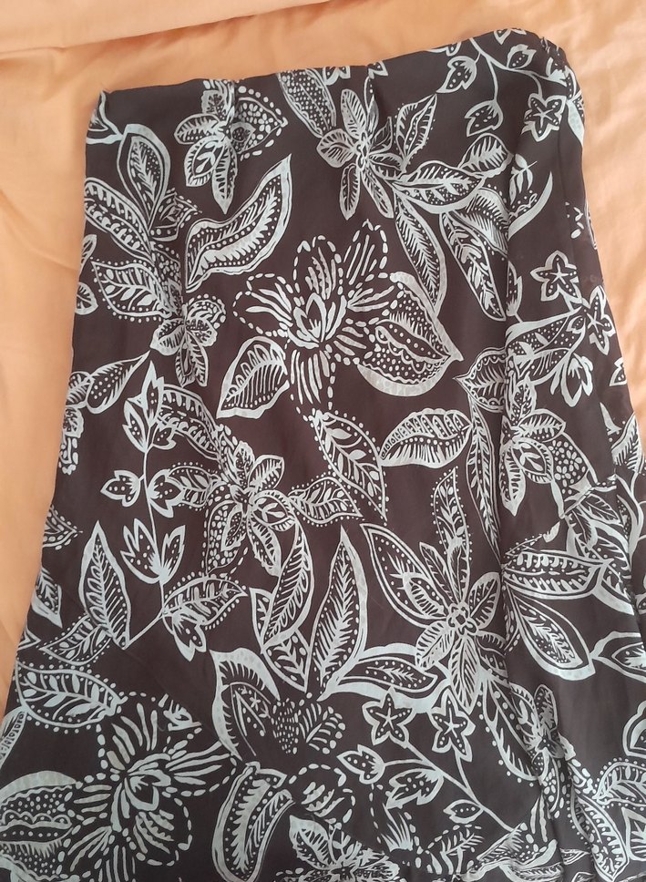 Kahverengi uzun etek, bol kesim ve drapeli tasarım ile çiçek desenlerine sahip bohem stilde. Beline lastik takılmıştır.