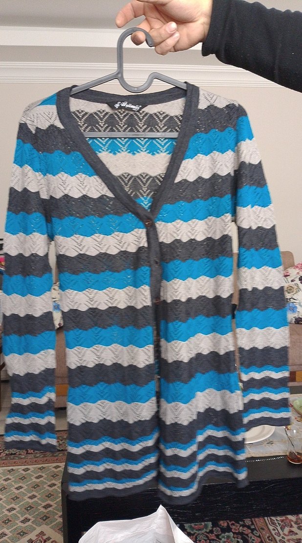 Gri, mavi ve beyaz tonlarında desenli, uzun kollu, V yakalı, bol kesim kadın hırka. Örme kumaştan, bohem ve rahat bir görünüme sahiptir.