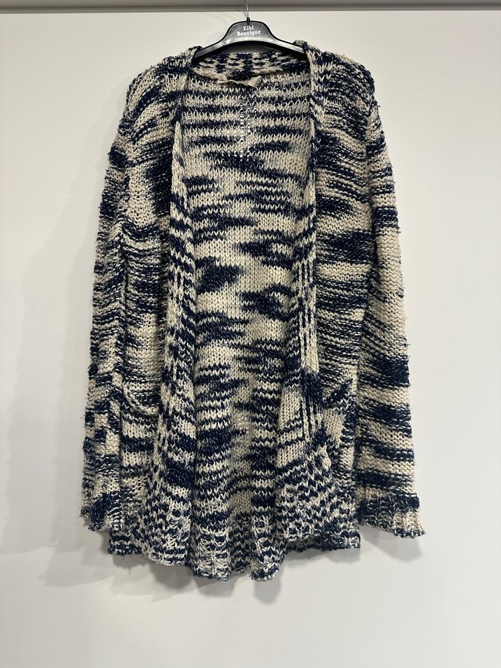 Kadınlar için uzun kesim ve bol fitli, bisiklet yaka örgü hırka. Gri tonlarında çok renkli batik desenli, rahat ve bohem tarzda günlük kullanıma uygun.