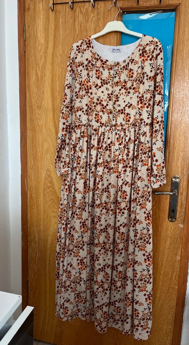 Uzun kahverengi elbise, bol kesim, uzun kollu ve yuvarlak yakalıdır. Drapeli tasarımı ve açık tonlarda batik deseni vardır. Sentetik kumaştan üretilmiştir.