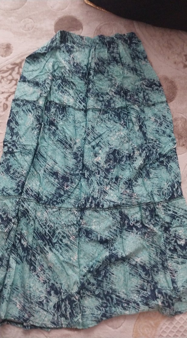 42 44 46 beden uyumlu.Sıfır Bohem tarzı, turkuaz ve gri batik desenli, drapeli, bol kesim uzun kadın etek, yumuşak sentetik kumaştan yapılmıştır.