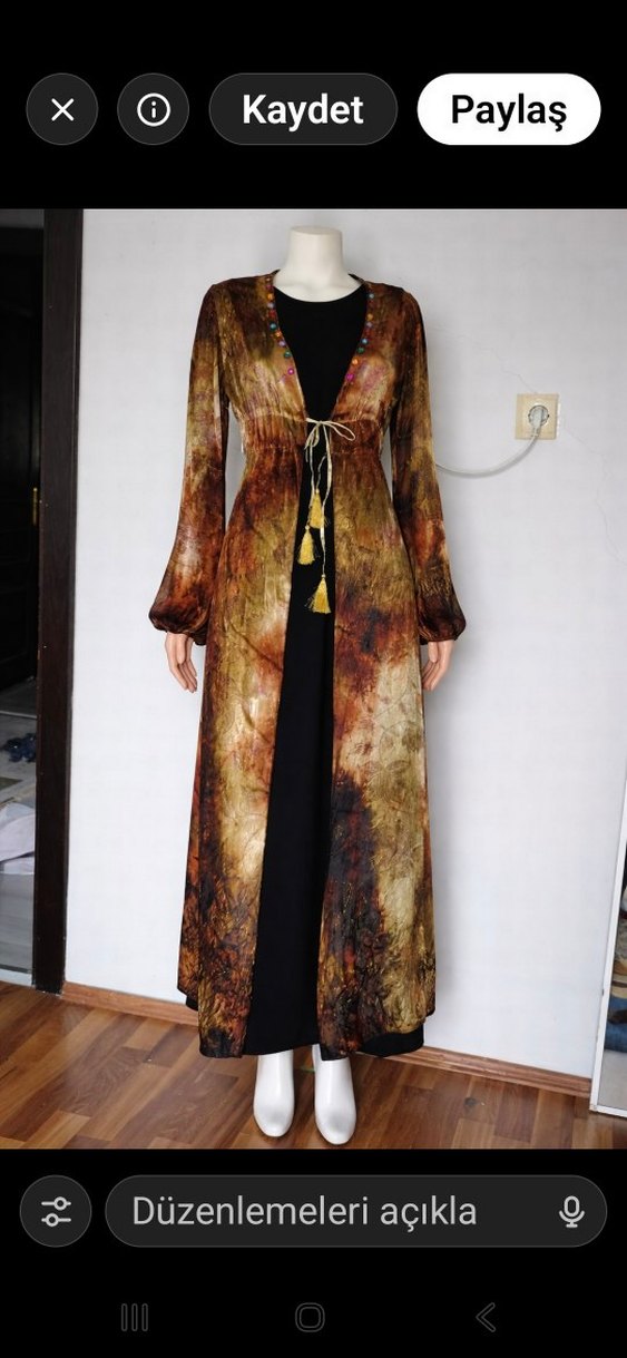 Bohem tarzda, uzun, kahverengi bağcıklı elbise. İpeksi kumaş, bol kesim, uzun kollu ve yüksek yakalı, bağcıklı detaylı.