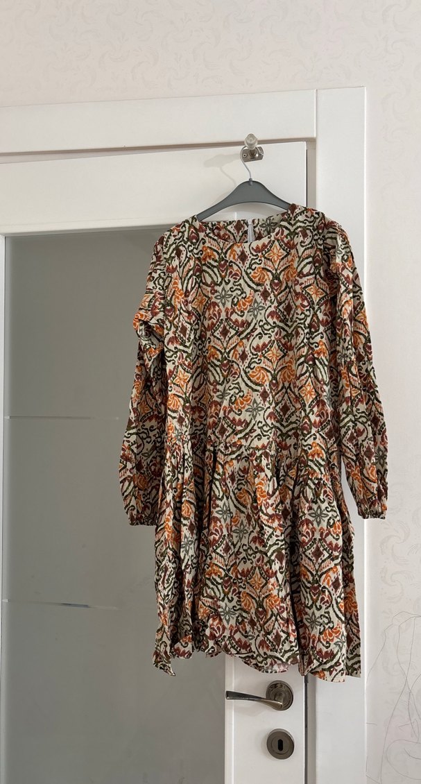 Uzun, bol kesim kahverengi bağlama desenli elbise, drapeli uzun kollu ve yuvarlak yakalı, günlük kullanıma uygun. Hamileler için de uygun