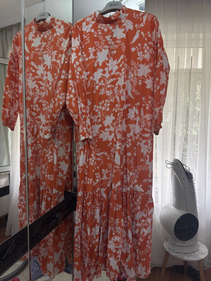Bol kesim, uzun turuncu elbise beyaz çiçek desenli. Yumuşak sentetik kumaştan, yüksek yakalı ve uzun kollu. Drapeli bohem tarzı yansıtıyor 2 elbise .