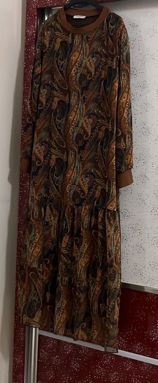 Yüksek yakalı, uzun kollu ve bol kesim uzun elbise, yumuşak sentetik kumaştan, kahverengi desenli ve drapeli detaylara sahip. Şifon bi elbisedir iç astarı uzundur.