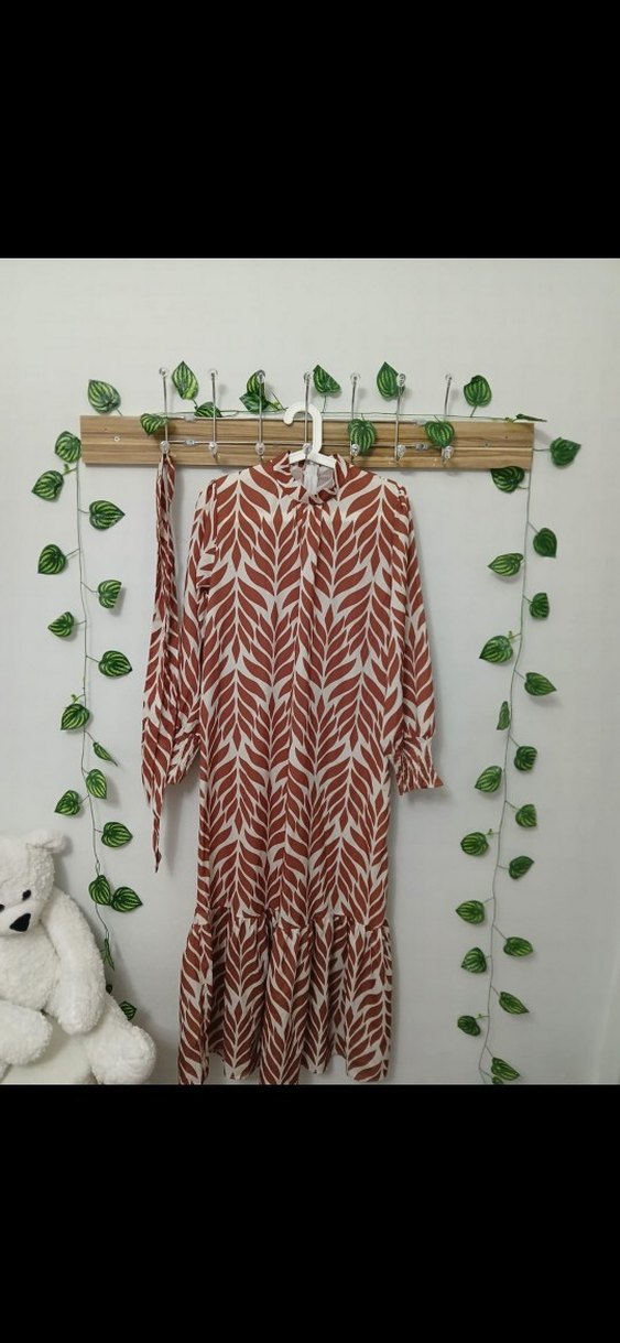Yüksek yakalı, salaş kesim uzun elbise, asimetrik detaylı ve ince askılıdır. Açık kahverengi tie-dye deseni bohem tarzını yansıtır. Uzun kahverengi elbise 38 40 42 beden uyumlu 135 cm uzunluk 54 cm genişlik kuşaklı alt kısım pileli kolları büzgülü arkası fermuarlı şık elbise