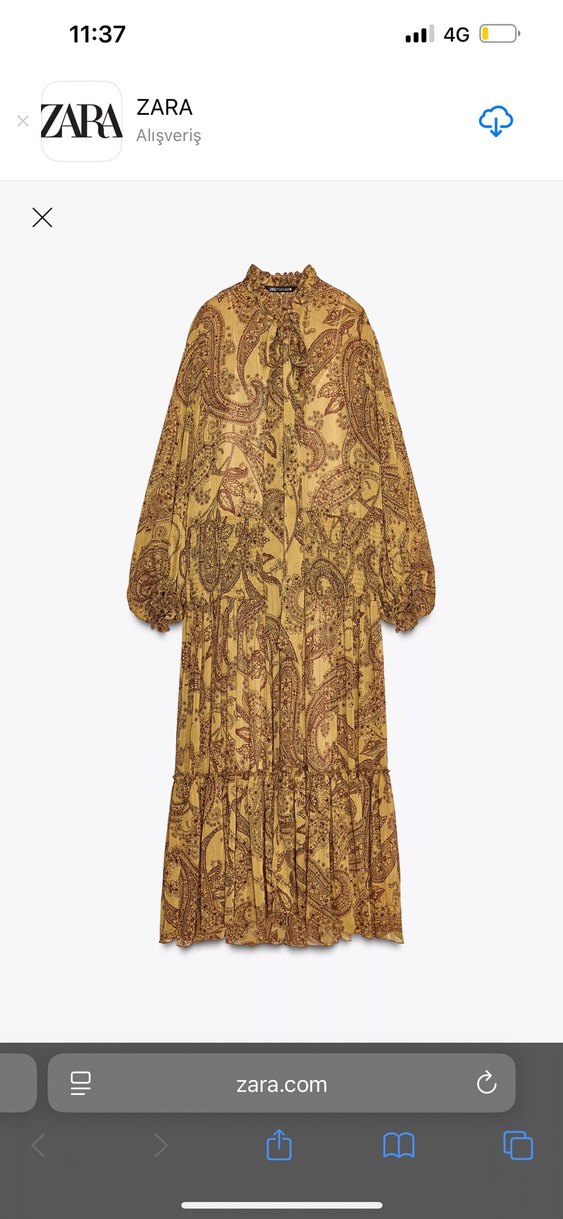 Yüksek yakalı, uzun kollu, kahverengi desenli bohem tarzda, bol kesim ve drapeli uzun elbise. Günlük kullanıma uygun. Etiketli hiç kullanılmadı zara markası